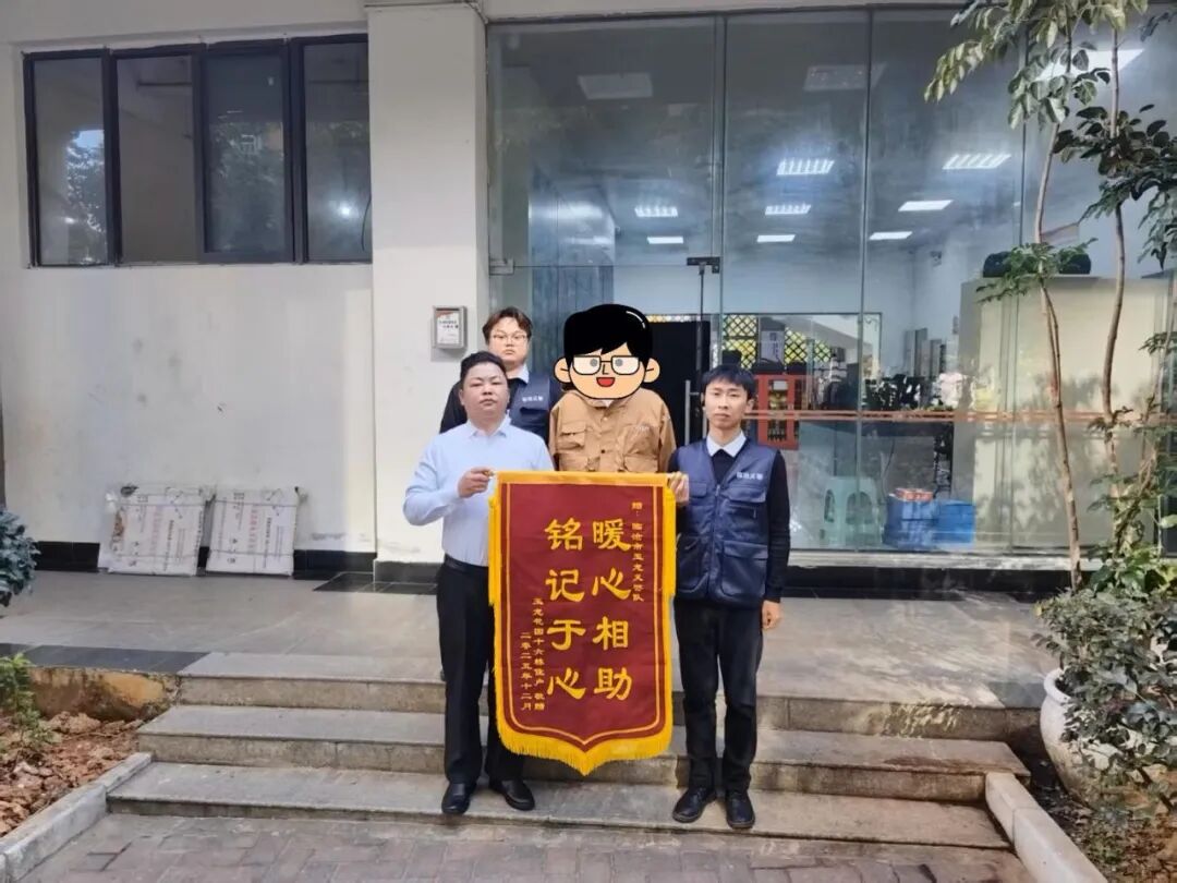 一面锦旗,一份信赖;一次救援,一片温情。12月9日,临翔区忙畔街道玉龙小区居民李某某专程找到玉龙义警队,将一面印着 “暖心相助 铭记于心” 的鲜红锦旗送到义警队员手中,再三感谢他们火速找回离家出走的孩子,用实际行动守护了家庭平安。