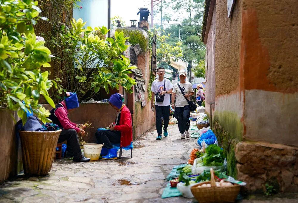 两名游客在昆明市乐居村游玩时经过村内菜市场。陈欣波 摄